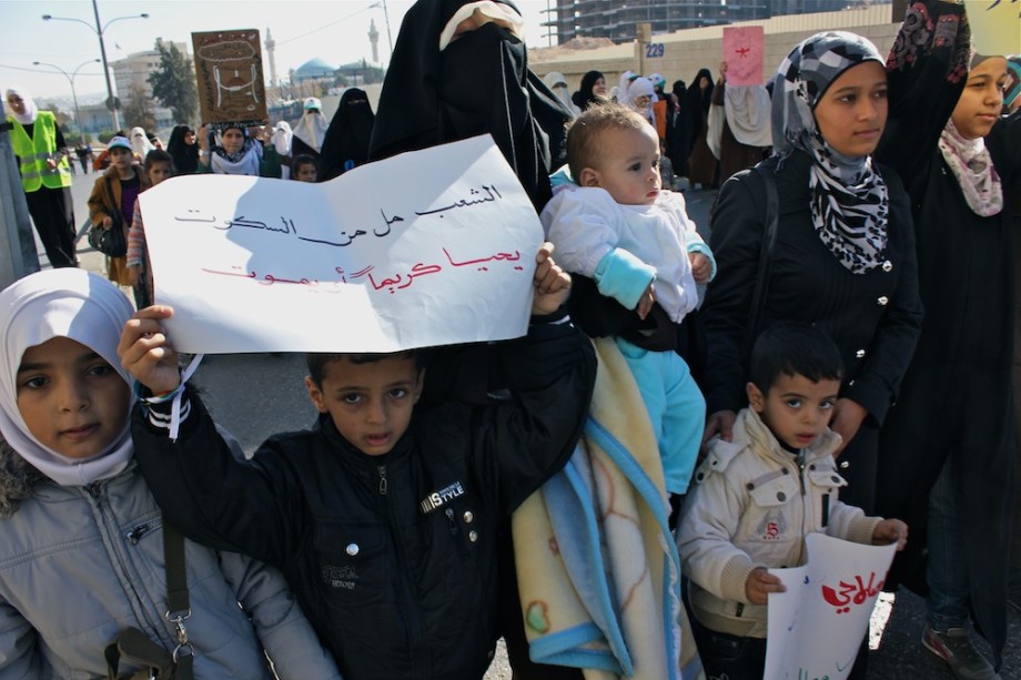 A family protests among the thousands who came out today to call for regime reform. The boy holds a sign that reads the same as a chant that rang out in the streets, “The people are tired of silence, live in dignity or die.”