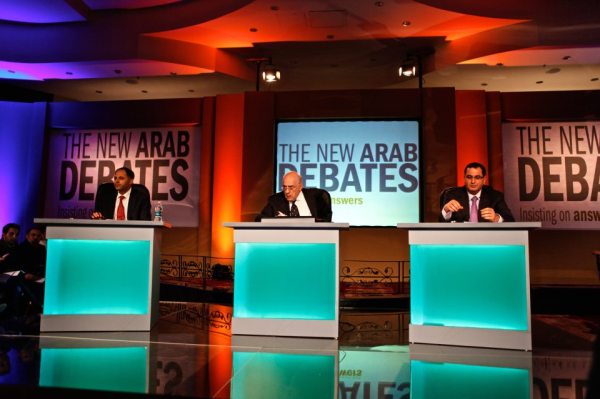 (From left) Dr. Hassan Barrari, moderator Tim Sebastian of the BBC and Salaheddine Al Bashir participate in a rare public dialogue between government support and opposition on December 10 at the Landmark Hotel as part of the New Arab Debates in Amman. Photo credit ©Omar Alkalouti