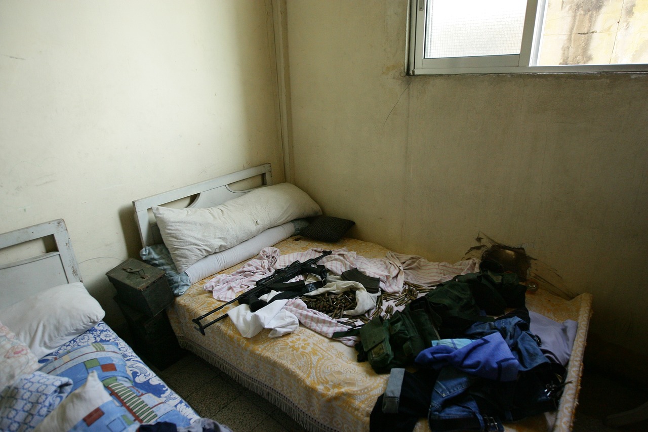 A bed of one of the Sunni fighters. People are stashing their weapons everywhere from weapons to shops because of the instability in the country.