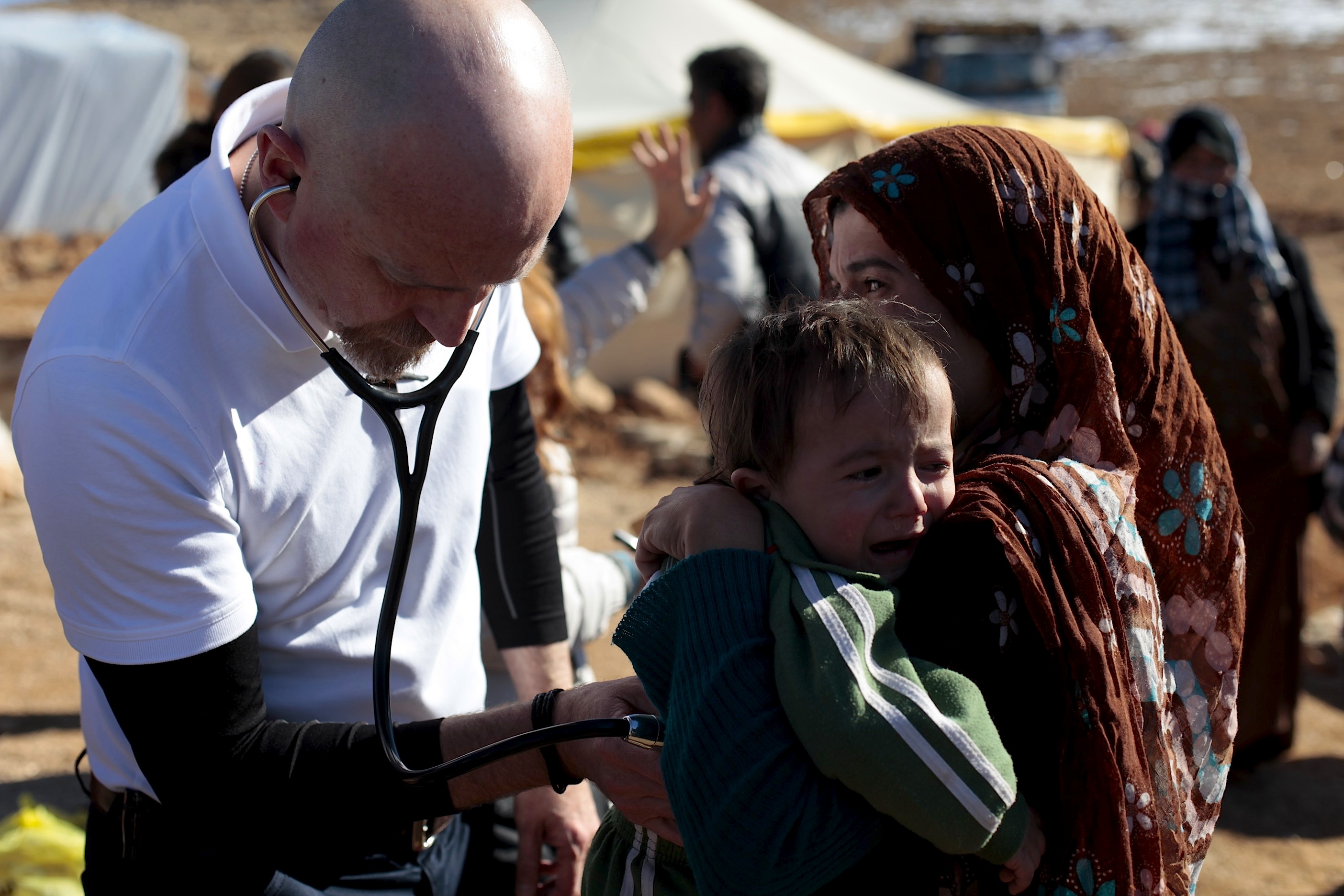 Dr. Batley examines a two year old boy from Al Qusair who has a harsh cough. Tuberculosis is a fear for the Syrian refugees in Arsal do to their unhygienic conditions and lack of aid and medical care. Photo by Omar Alkalouti.