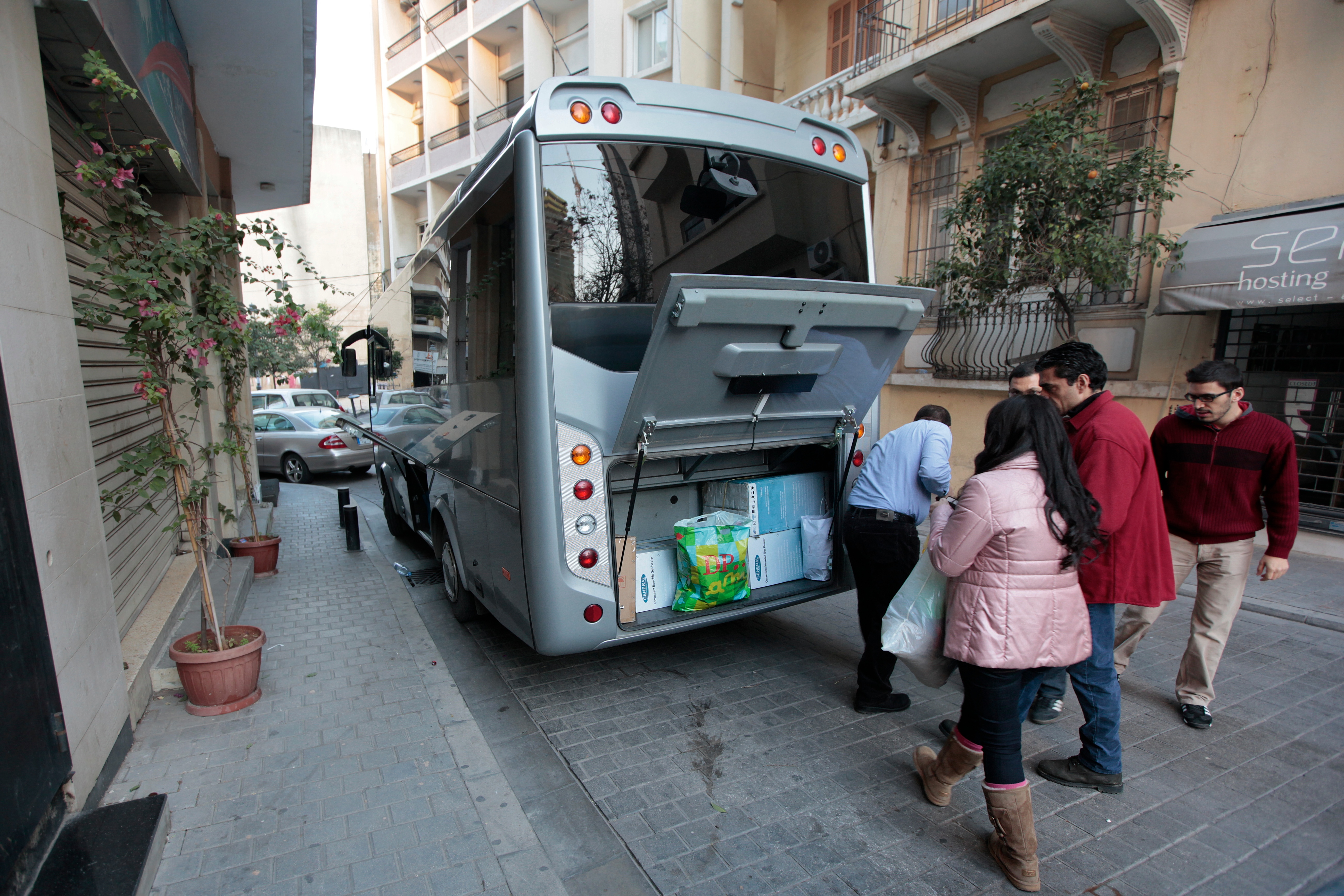The volunteers from Lebanese for Syrians initiative pack the rental bus full of aid for the Syrian refugees in Arsal, Lebanon. Photo by Omar Alkalouti.