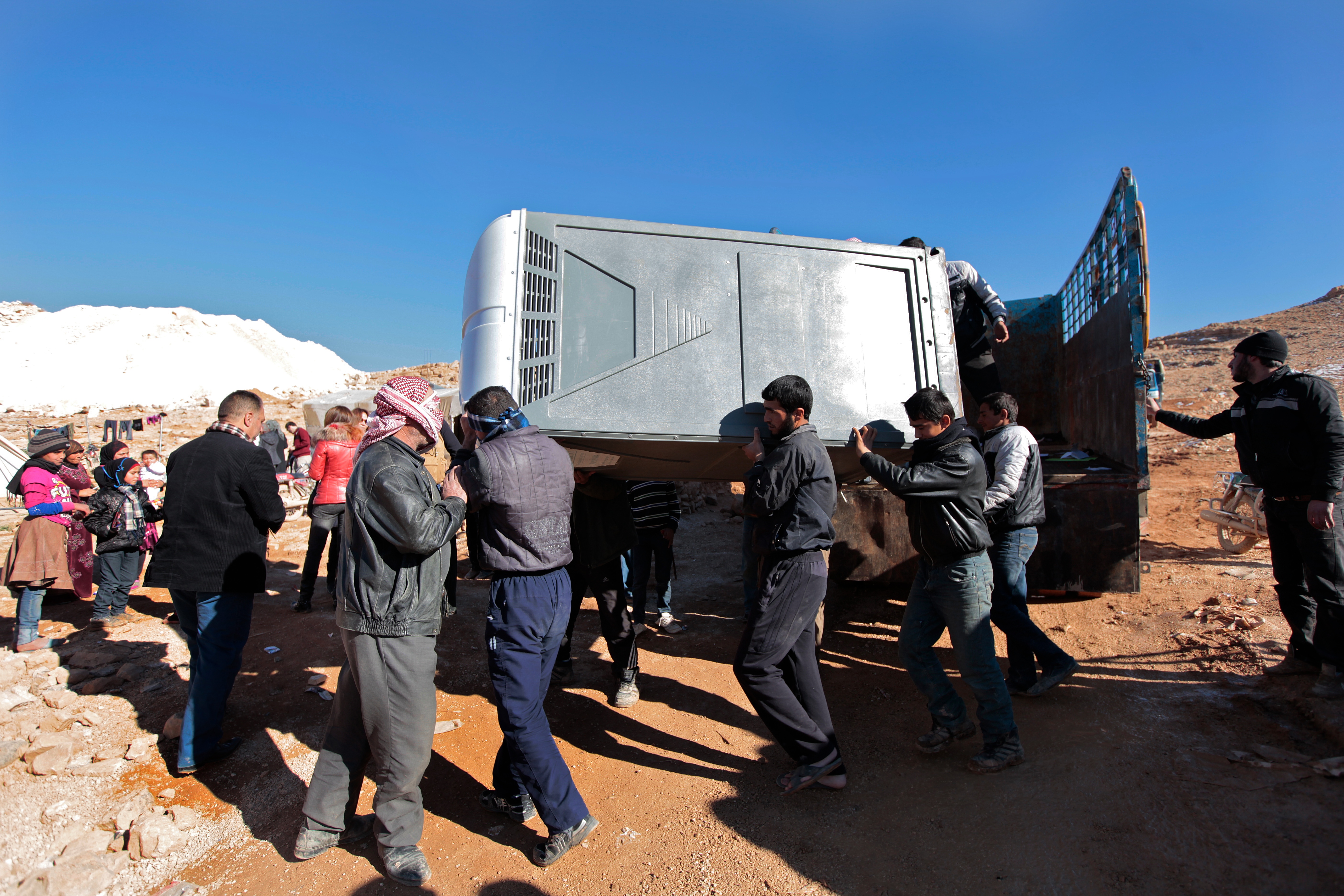 Portable toilets are unloaded off trucks donated by private Lebanese citizen through Lebanese for Syrians. Photo by Omar Alkalouti.