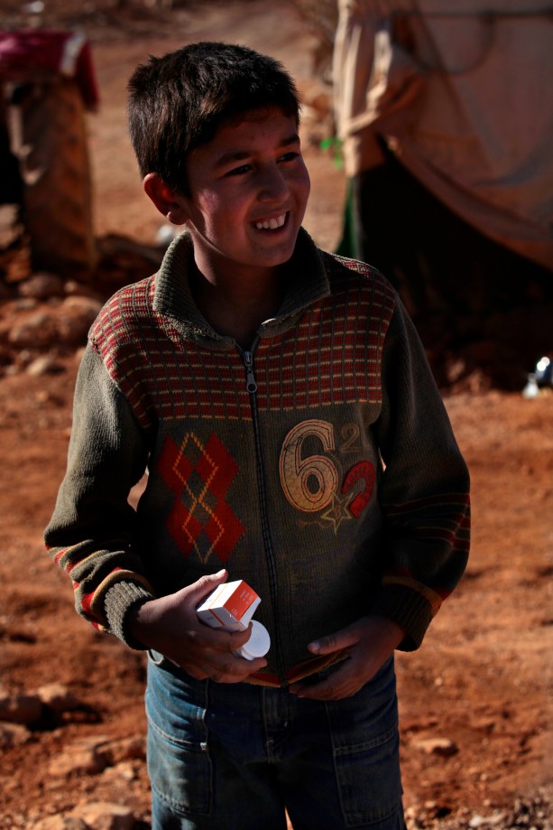A young Syrian boy smiles as he receives medicine from the Lebanese for Syrians group after being examined by the volunteer doctor, Dr. Nick Batley. Photo by Omar Alkalouti.