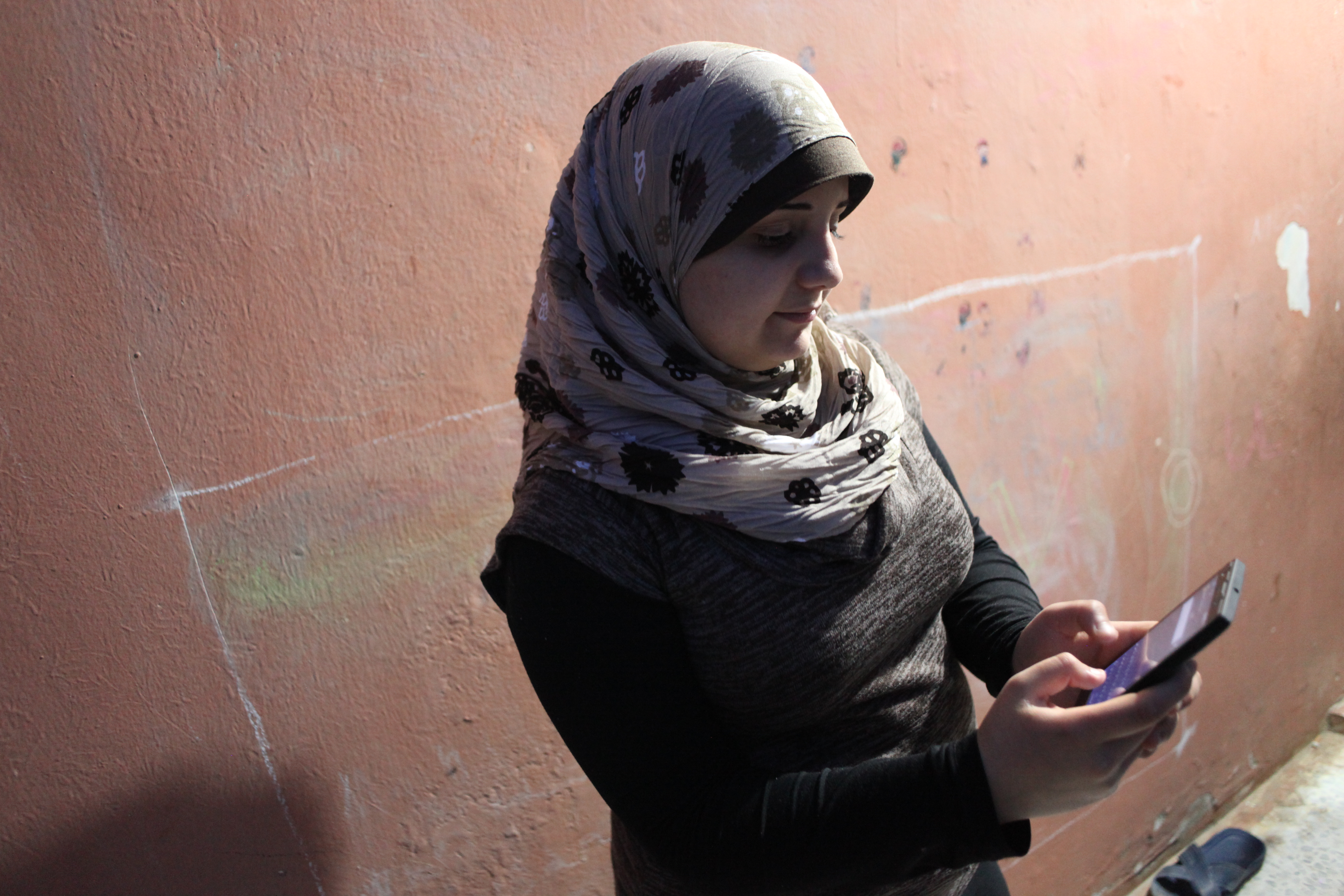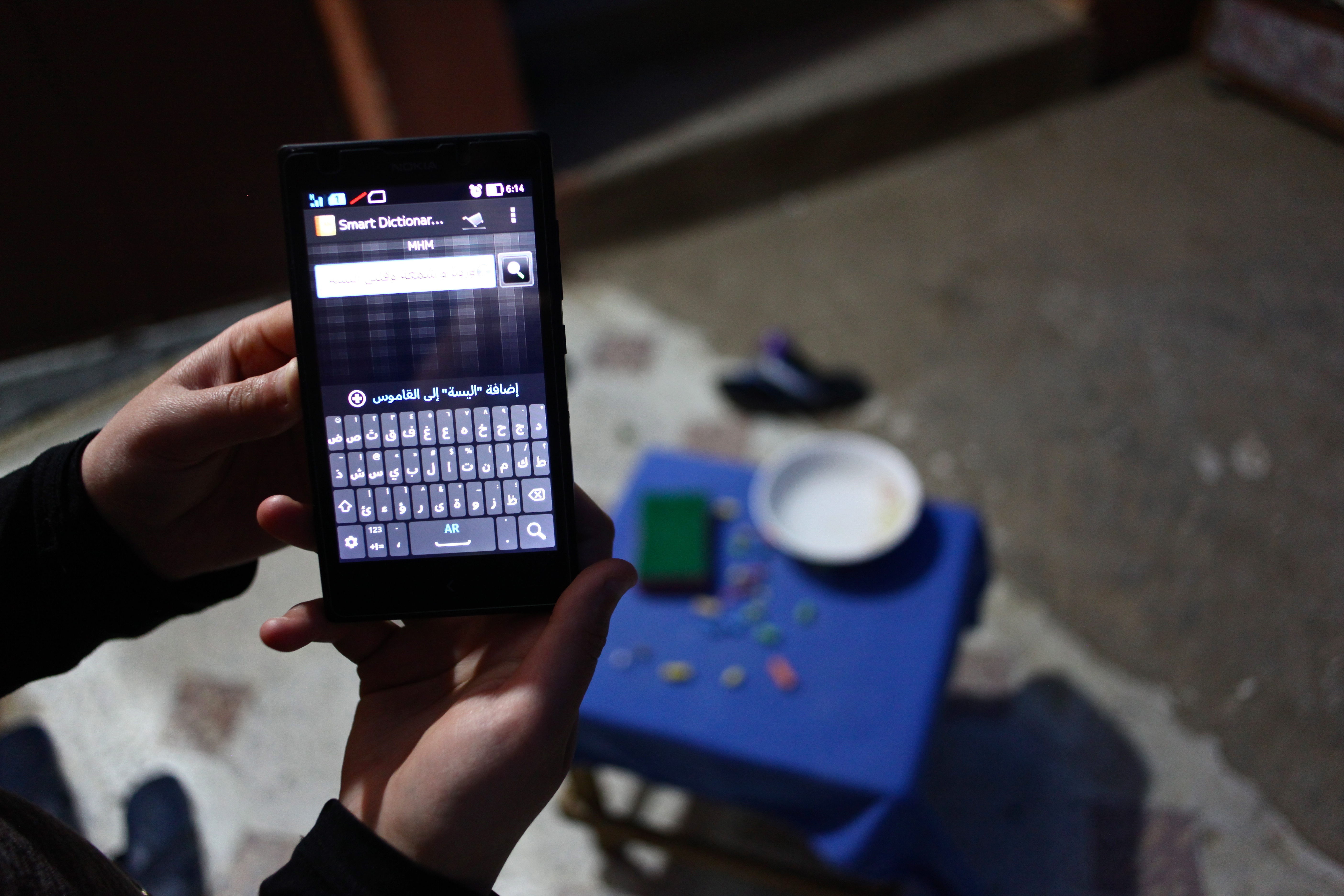 Amal Haddad holds her mother’s cell phone in her hand, with the app, “Smart Dictionary,” that she uses to help her with her homework.