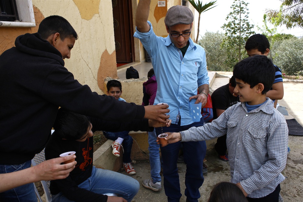 On a Friday afternoon, a busload of Syrian refugee children from a nearby village arrive at the Intersos center in Mazboud. Here, project coordinator Firas Abi Ghanem shows them how to plant basil seeds in cups to explain how herbs grow.