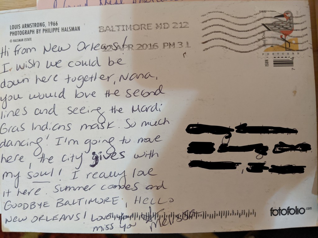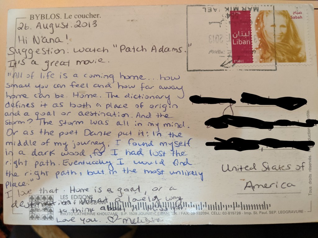 I spent most of my 20s away from my family, friends, familiar places. My mother’s mother, my Nana, was one of many beautiful people in my life I missed deeply during that time. I sent her postcards over the years from the places I lived and traveled in, and today, those postcards were returned to me.