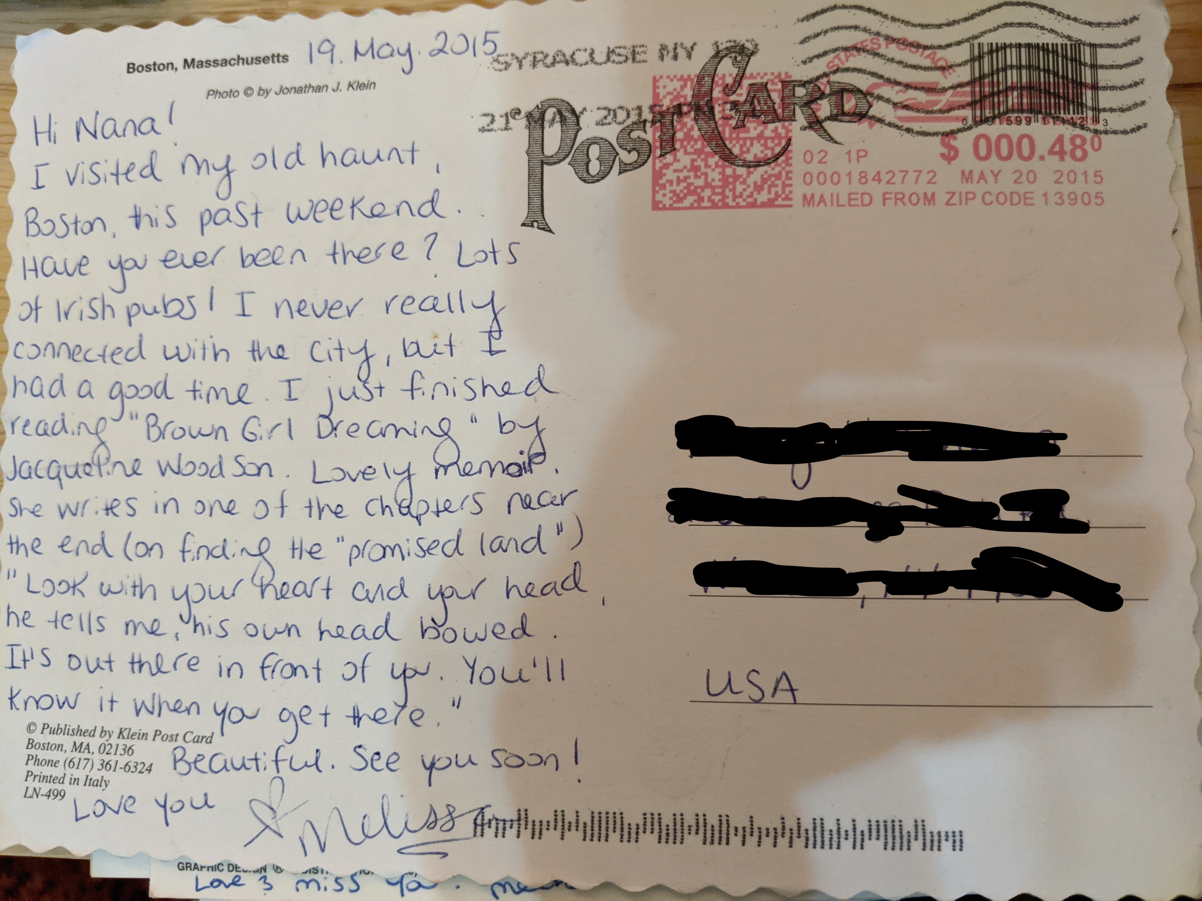 I spent most of my 20s away from my family, friends, familiar places. My mother’s mother, my Nana, was one of many beautiful people in my life I missed deeply during that time. I sent her postcards over the years from the places I lived and traveled in, and today, those postcards were returned to me.